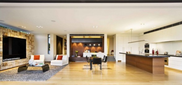 The living space is concealed behind a timber battened garage door and entry gate to the street, but then reveals itself as one enters of the site and moves through the landscaped garden from the front gate to the front door. Only glimpses of the panoramic water view which are lies beyond are revealed along this journey. By entering the house and keep moving into the large open plan Living/Dining/Kitchen, the full impact of the stunning views is felt. The substantial living space with its large sliding windows and high ceilings flows out and becomes one with the outside encouraging the indoor/outdoor lifestyle. The two living areas and the guest wing are located on the middle level with three bedrooms on the upper level, while the main one designed as a luxury suite, they are exist in the main entry. In the lower level is incorporates a large rumpus / media room and the store areas.